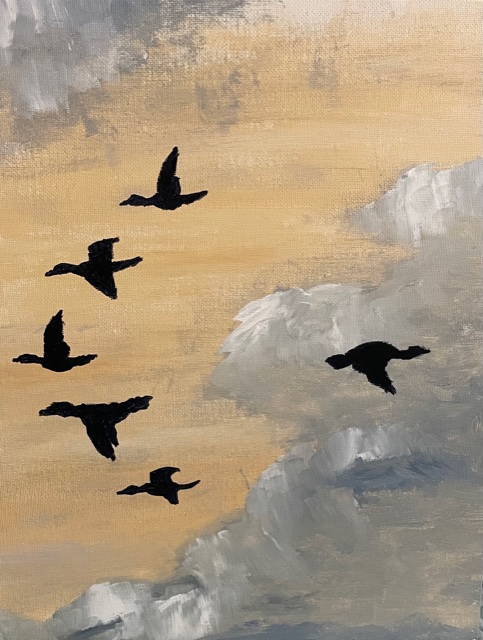 Only one bird is going the opposite way in this painting. During the Holocaust, the majority went along with the crowd. Few did the hard thing and “flew” the other way.